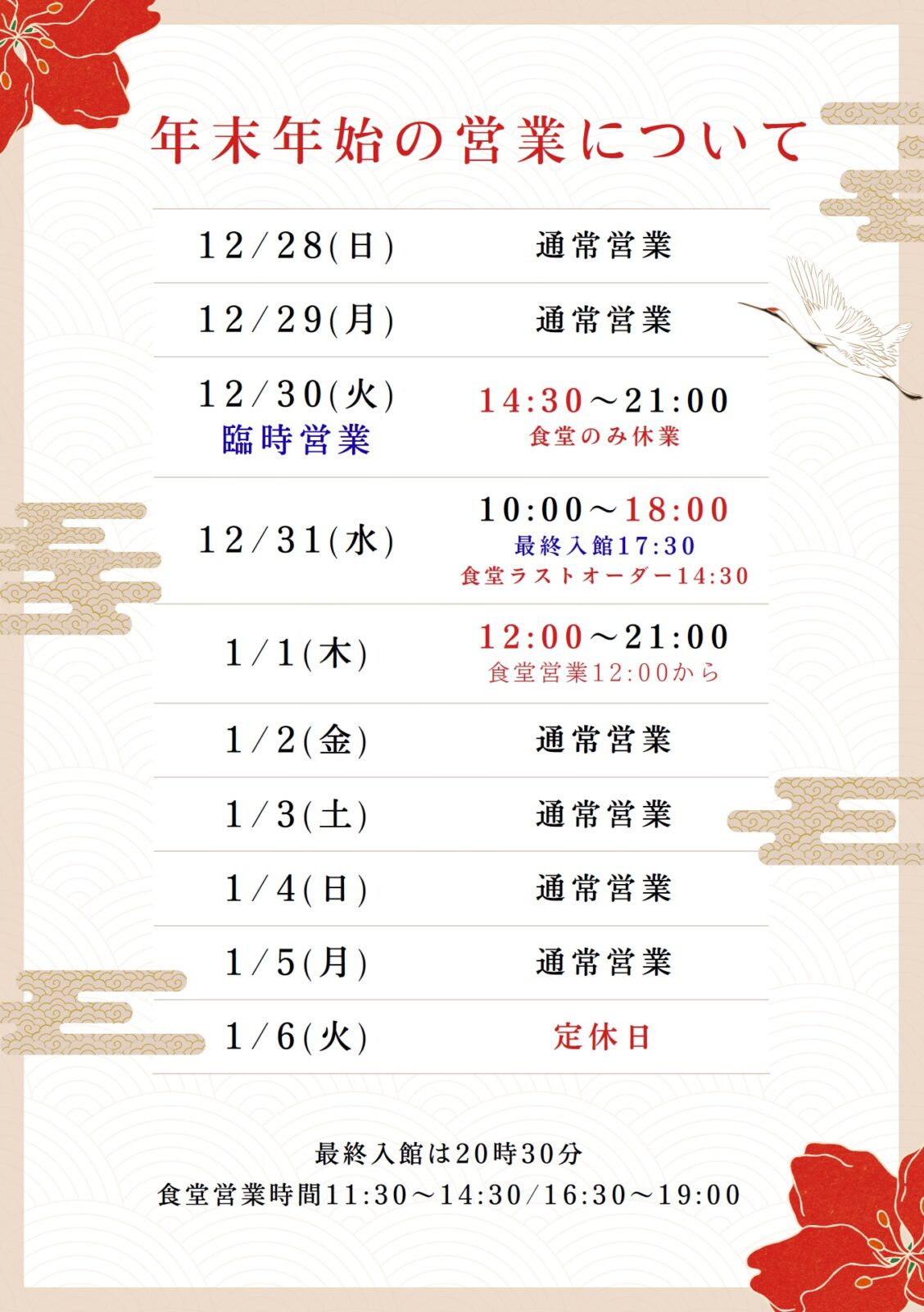 なお、12月30日、31日、1月1日は時間短縮営業となりますので