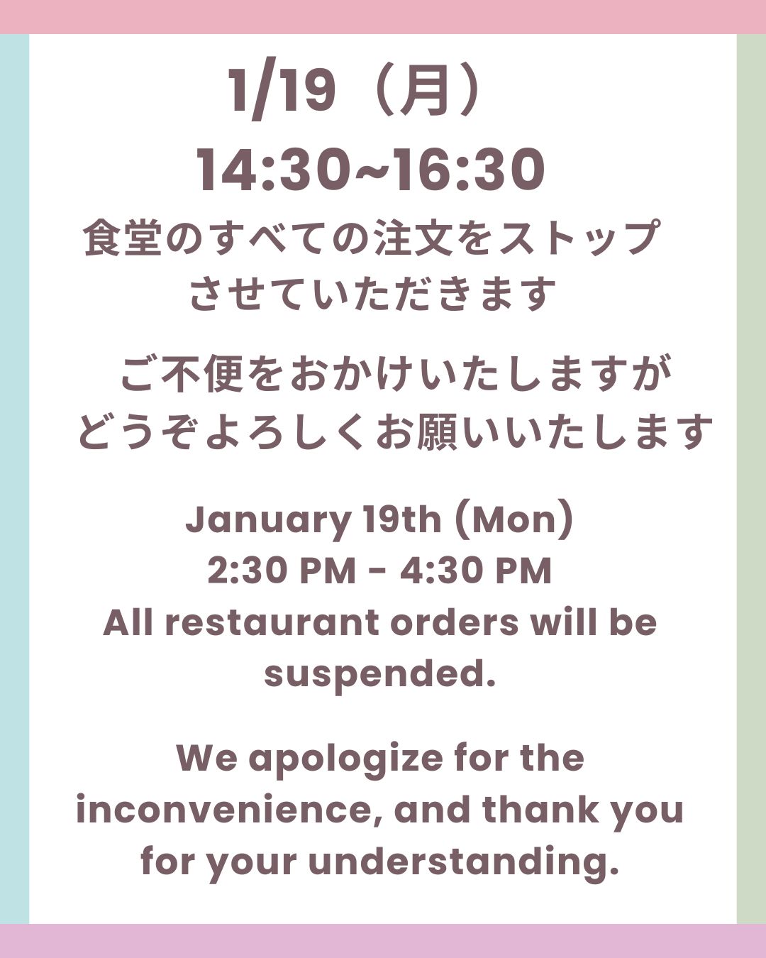 【食堂からのお知らせ】1月19日の食堂営業について